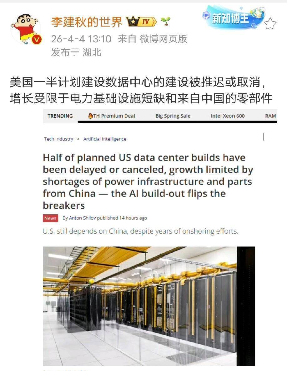 【好意思国AI数据中心多数停建,着实原因澈底涌现】浑沌嗅觉好意思国的AI泡沫吹不下去了,当今好意思国一半的规画辅助的数据中心的辅助被推迟大概取消了。