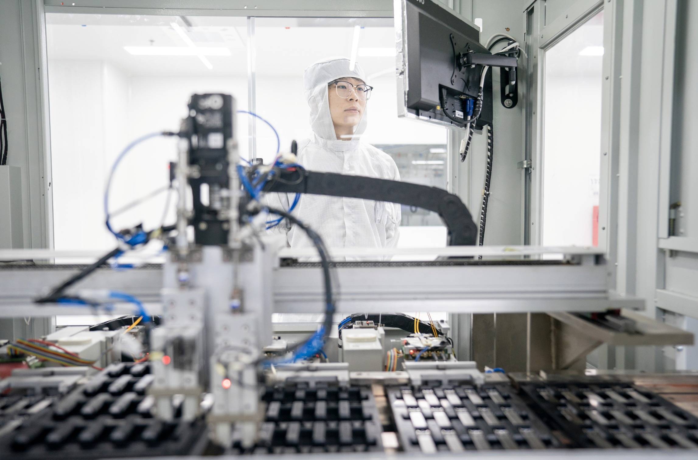 华工科技光电子信息产业研创园洁净厂房,正在出产高速光模块(魏铼 摄)